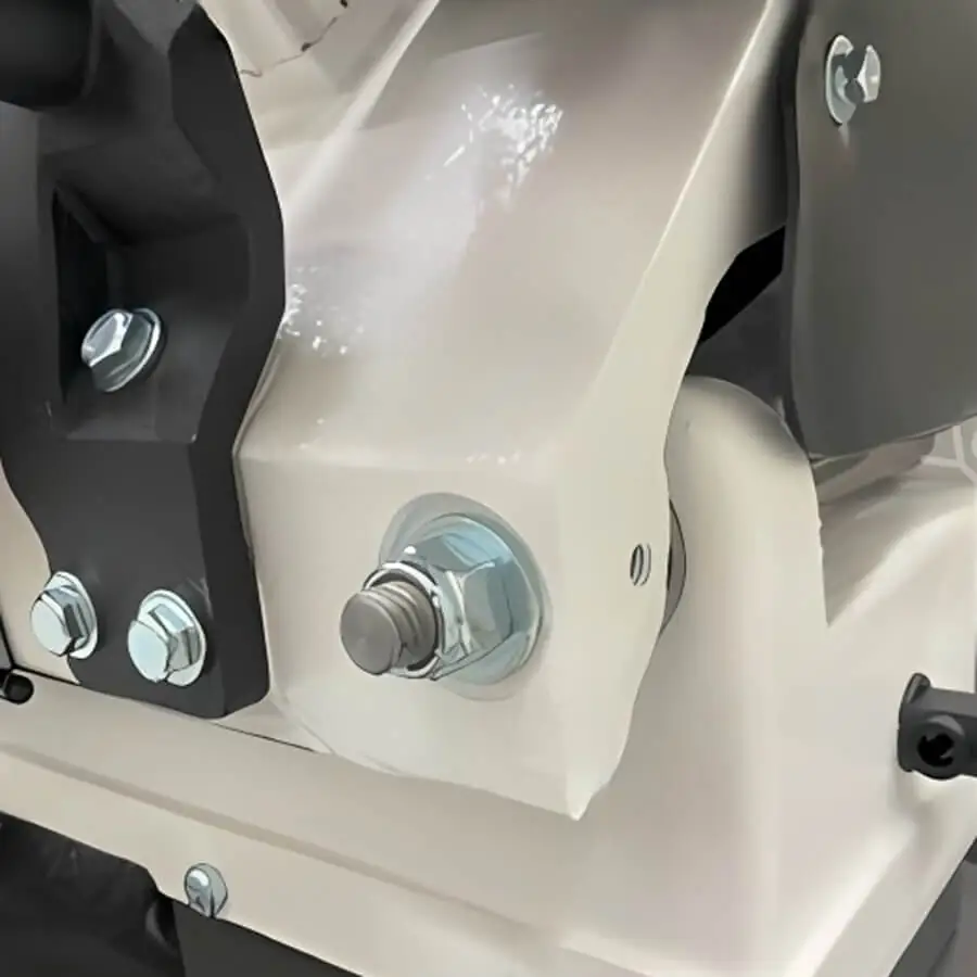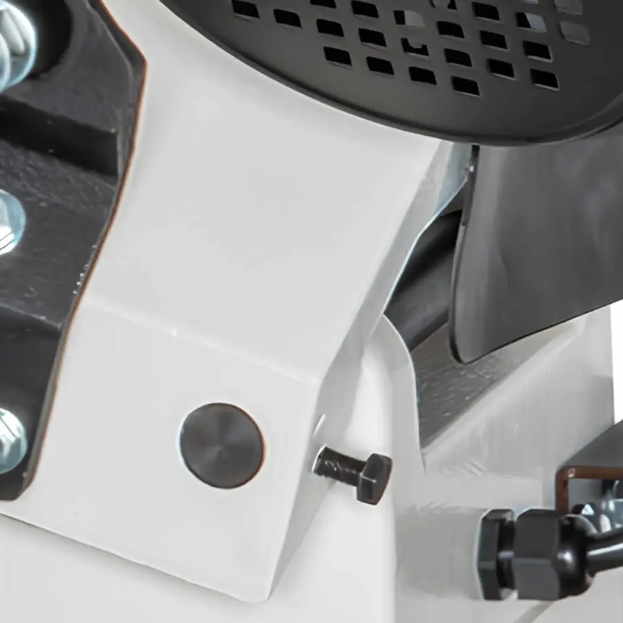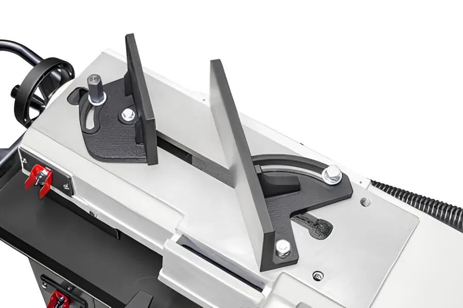 Feedback from user experience surveys led us to change from the use of locking screws to standard hex head nuts for both the swivel vise and the axial locking nut of the RF 712-N metal cutting bandsaw. This is an example of integrated design where complexity is reduced by implementing simpler systems that are preferred by customers for their ease of use. We include a 19mm crescent wrench in the machine tools and accessories box, and no special tools are required.